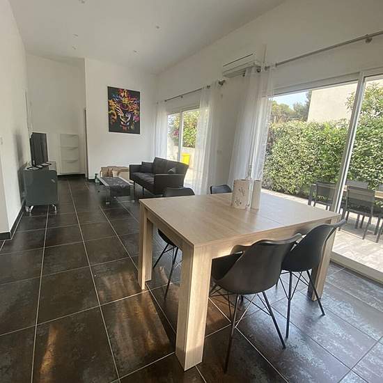 IMMO FORUM Agence de la Côte vous propose à la location à l'année cette maison meublée T3 de plain pied d'environ 54 m² de type 3 à proximité des plages du Cap Rousset de Carry le Rouet. Cette maison récente se compose : d'une entrée sur séjour avec cuisine équipée ouverte et sa buanderie, donnant accès à un jardin et une belle terrasse plein sud d'environ 30 m². Un dégagement dessert l'espace nuit, disposant de deux chambres avec placards et d'une salle d'eau avec WC. Vous disposerez de tout le confort, puisque le bien est équipé d'un sèche...