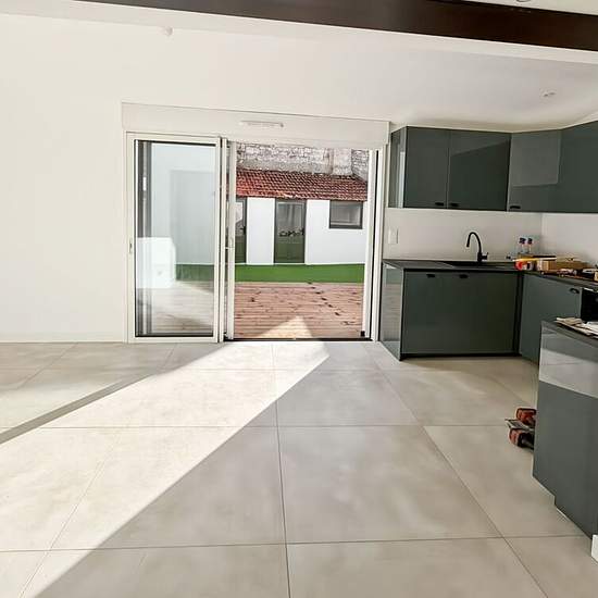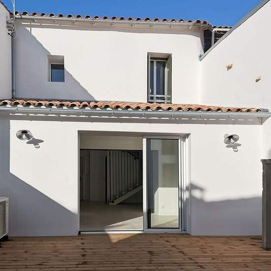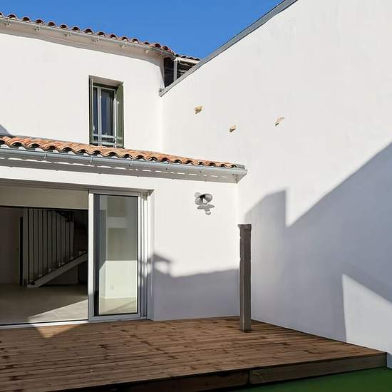 Maison de charme, rénovée, avec jardinet, au centre du Bois Plage. Maison dans le centre village du Bois Plage, entièrement rénovée avec goût, elle se compose : Au rez-de-chaussée : d'un sas d'entrée commun, une entrée avec WC, un salon séjour avec cuisine aménagée et équipée (four, plaque, hotte, lave-vaisselle). A l'étage : un palier desservant 2 chambres dont 1 avec placard aménagé, une salle d'eau, un WC. Belles prestations et confort avec chauffage au sol, climatisation. Jardinet clos de murs avec terrasse bois et dépendance de stoc...