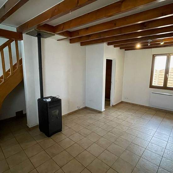Maison À Louer. Serris, Vieux Bourg, Maison de ville type 3 en duplex, de 59,92 m² habitables (74,48 m² utiles), comprenant au RDC : Entrée, cuisine, séjour avec poêle à granulés, toilettes, cellier ; A l'étage : Deux chambres, salle d'eau, débarras. Jardin non clos, Place de stationnement. Chauffage électrique.