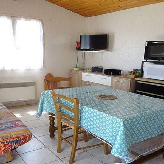 Maison simple comprenant un séjour (TV + clic-clac) /kitchenette (four, réfrigérateur-top, 2 plaques vitro-céramique), 2 chambres: 1 lit 140 et 2 lits superposés, salle-d'eau (lave-linge) avec WC. Jardin clos, entrée voitures, salon de jardin + barbecue, proche lac (aire de jeux enfants, promenades, restaurants, boîte de nuit) et 1 km du centre, 200m du supermarché. Surfaces et distances données à titre informatif et non contractuel Ces prix s'entendent consommations incluses en saison. Taxe de séjour en plus. Nous acceptons les chèques-vaca...