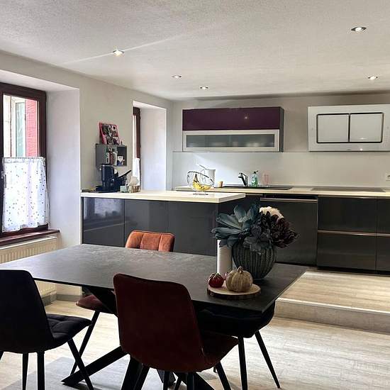 THANN Maison en triplex 4 pièces 103.16 m². Située dans une impasse avec vue sur les montagnes et la Thur, maison de ville en triplex de 103.16m² avec stationnement à proximité. La maison est composée au RDC d'une entrée avec l'escalier qui mène aux pièces de vie ainsi qu'une cave/chaufferie-buanderie. Au premier étage se trouve une cuisine équipée ouverte sur le séjour et un coin bureau Au deuxième étage, 1 chambre avec une pièce en enfilade qui peut faire office de bureau OU de petite chambre d'enfant ainsi qu'un WC avec lave mains. S...