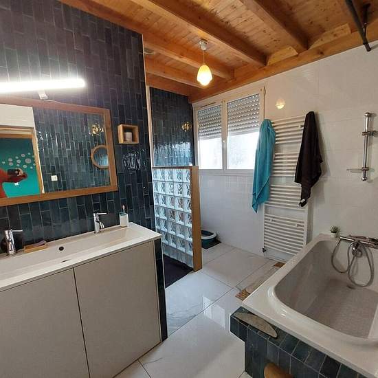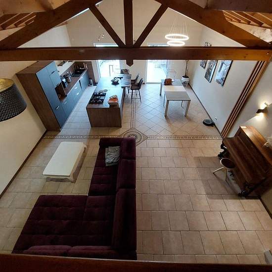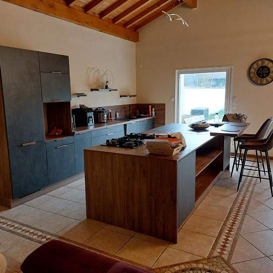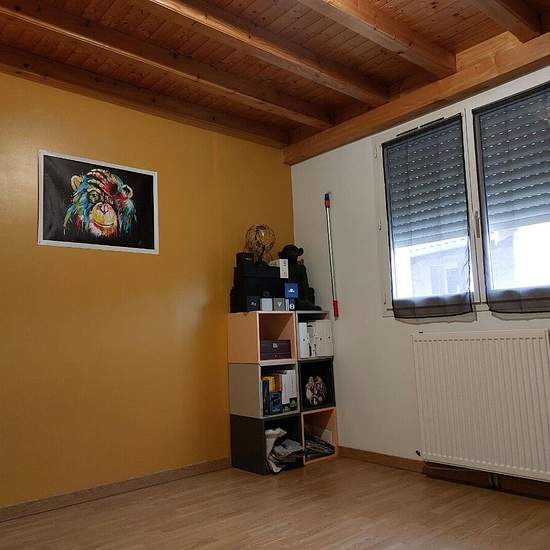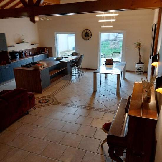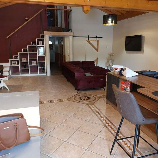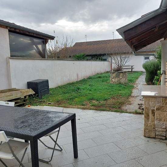 AMBERIEU EN BUGEY - Rue Alexandre Bérard - en retrait de la route - venez visiter cette maison de 116,45 m² offrant au rez-de-chaussée un dégagement, avec un coin de rangement, desservant l'accès à 2 garages avec portes électriques, un wc suspendu avec lave-mains et une belle pièce de vie avec un plafond cathédrale d'env. 60 m² comprenant une belle cuisine meublée et équipée (lave-vaisselle, plaque de cuisson gaz, micro-ondes, réfrigérateur avec une partie congélateur) avec fenêtre galandages donnant accès au jardin d'env. 200 m² avec terras...