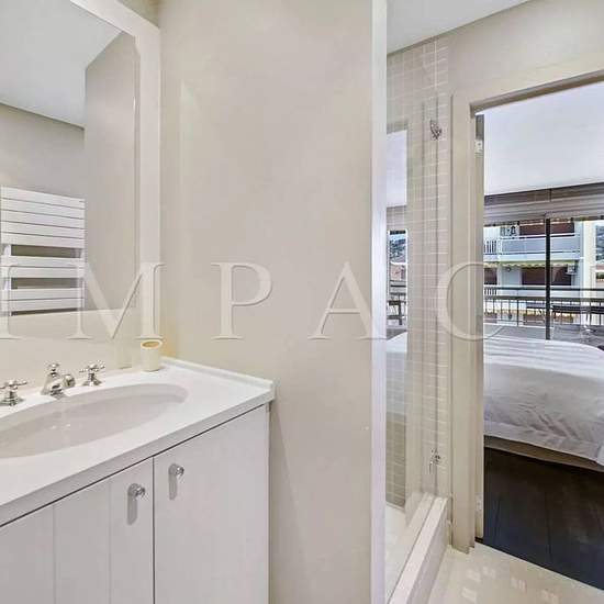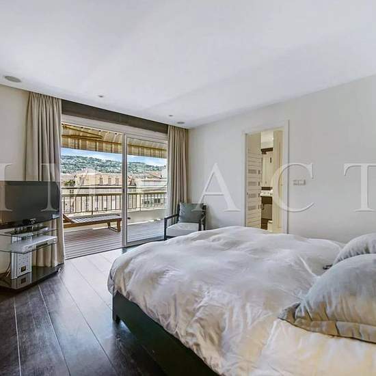 Appartement traversant sud/nord de 89m², 2 chambres et 3 terrasses. Descriptif : Grand hall d’entrée de 15 m² Beau séjour équipé d’un canapé, télévision écran plat et cave à vin, table à manger pour 4 personnes, donnant sur une terrasse exposée sud d’environ 10m² avec vue dégagée sur le Carlton et équipée d’un salon d’été : canapé 2 places, fauteuil et table basse. Chambre N°1 : Lit double (180cm x 200cm), dressing, télévision. Salle de douche en suite avec douche, sèche serviette et toilettes. Terrasse privée exposée Nord, vue colline, d’en...