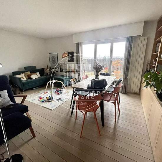 Bas de Chatou, Rue de la Liberté, à 8 minutes à pied de la gare RER et à proximité immédiate des commerces, Très bel appartement de 75m² en dernier étage avec ascenseur d'un immeuble de standing, comprenant : une entrée avec placard, une grande réception donnant sur terrasse, une cuisine aménagée et équipée donnant sur un balcon, un dégagement avec de grands placards, deux chambres, une salle d'eau et un wc séparé. L'appartement est complété par une cave et une place de parking en sous sol dans une résidence attenante. Disponible le 13 févri...