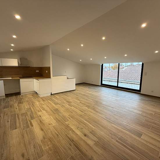 Nîmes, écusson, rue de l'Aspic. Duplex inversé, T4 entièrement rénové d'une surface de 91,21m², situé au 3ème étage sans ascenseur. Comprenant : une cuisine ouverte donnant sur un grand séjour climatisé, trois chambres climatisées dont une avec dressing, une salle d'eau, une buanderie et deux wc séparés. Disponible de suite. Loyer : 1090 € charges comprises (eau froide, ordures ménagères et entretien des climatisations). Honoraires : 1000 €, dont 273€ pour l'état des lieux. DPE : B. Les informations sur les risques auxquels ce bien est expo...