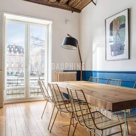L'Agence Dauphine Rive Gauche vous propose à la location un splendide appartement meublé en Duplex avec vue exceptionnelle sur la Seine comprenant : un séjour-salle à manger avec balcon (exposition Sud Ouest), une cuisine entièrement équipée, deux chambres dont une avec un coin bureau, un dressing et une salle d'eau, une salle de bains et douche. Prestations Haut de Gamme avec poutres, parquet et climatisation. BAIL SECONDAIRE EXCLUSIVEMENT OU BAIL SOCIETE pour une durée minimum de 12 mois