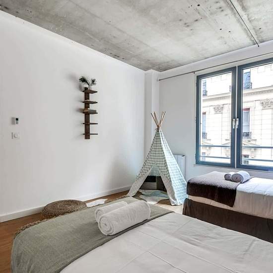 [EN] In the upscale Saint-Lazare district, the three-bedroom Milan IV Sweett apartment will give you a classic Parisian experience. Our local interior designer has combined style with comfort in this rustic vacation apartment. With ethnic wall art, hanging plants, and high ceilings, this sweet retreat has a bohemian flair. Huge windows let in lots of natural light, and the plush bedrooms invite you to kick back and relax. A fully equipped kitchen has everything you need for fine French dining. Located in the IXth arrondissement, this area is...