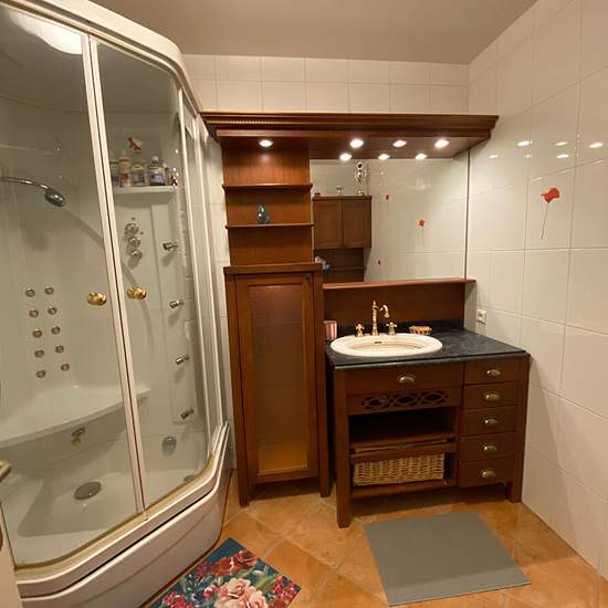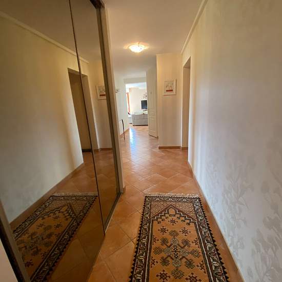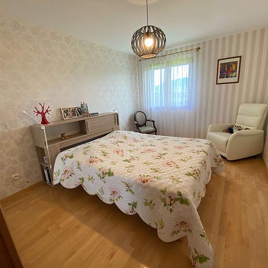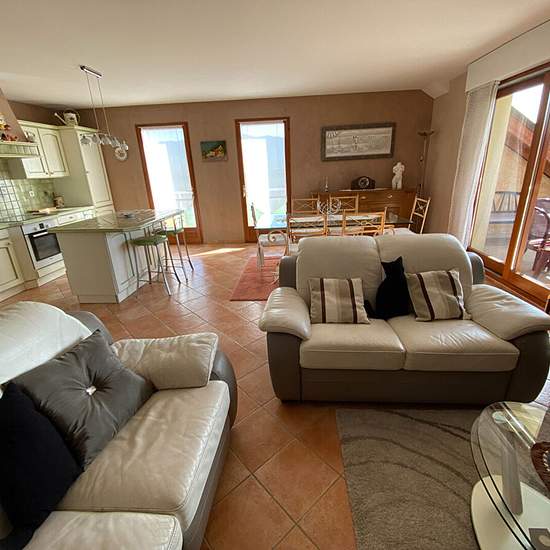 Exclusivité : A louer à REIGNIER-ESERY, impasse du Château de Polinge, dans un cadre exceptionnel, dans une petite copropriété de standing, T4 meublé de102.77 m² habitables situé au 1er étage sur 2 Cet appartement est composé d'une entrée dégagement avec 2 placards coulissants, d'un séjour ouvert sur une cuisine équipée de 38.87 m² donnant sur une terrasse exposée sud et un grand balcon exposé est, de 3 chambres dont une avec placard, d'une salle d'eau avec douche balnéo et d'un wc séparé. L'appartement dispose d'une cave privative , d'un st...