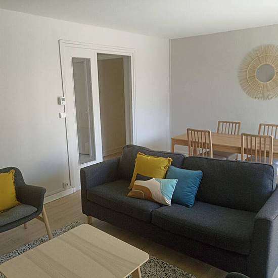 AU THEATRE DES ARTS - rue du Général Giraud F4 entièrement MEUBLE de 72,25 m², au 1er étage, comprenant : séjour avec télévision 4k, cuisine aménagée et équipée avec lave-vaisselle, 3 chambres avec placard, salle de bains avec machine à laver. Garage fermé dans la cour + Cave + Local vélo. Chauffage électrique et eau, individuels. Isolation extérieure de l'immeuble refaite à neuf. Disponible dès maintenant.