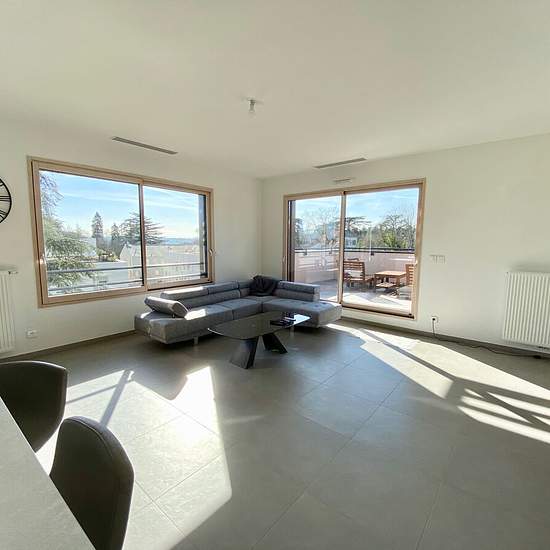 Très bel appartement T4 dans résidence neuve Pitance à Saint Cyr au Mont d'Or au calme et proche du centre. Vous serez séduit par cet appartement familial baigné de lumière au 2ème et dernier étage et profiterez pleinement de sa terrasse de 25 m² au calme. Un séjour de 41 m² avec cuisine ouverte entièrement équipée et un accès à la terrasse de 25 m², 3 chambres avec placards dont une suite parentale avec sa salle de douche, une salle de bain, un WC, une buanderie avec lave linge et sèche linge. Chauffage individuel au gaz. Fibre, Volets roul...