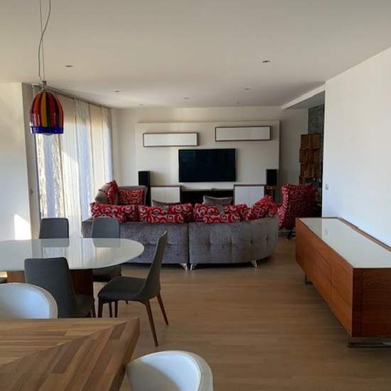dans la résidence Park Jean Monnet, appartement de 133 m2 au 4ème étage meublé avec goût. Entrée avec wc et placards , magnifique cuisine équipée, avec cellier et buanderie, ouvert sur séjour et salle à manger avec cheminée au bioéthanol donnant accès au balcon de 12.50 m2 couvert. 3 chambres, 1 salle de bains avec wv, et une chambre parentale avec salle de douches et wc. en annexe: un garage en sous sol inclus dans les charges: eau chaude et chauffage disponible le 20.01