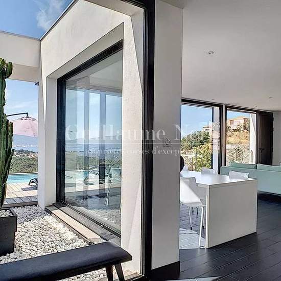 Perchée sur la Rive Sud, à seulement 5 minutes des commerces et de la plage d'Agosta, cette élégante villa contemporaine de plain-pied séduit par son charme et sa fonctionnalité. Elle dispose de trois chambres confortables, ainsi que de deux salles de bains, chacune équipée d'une douche à l'italienne et d'une baignoire. Le séjour lumineux et la cuisine américaine s'ouvrent sur une vaste terrasse en bois, agrémentée d'une piscine, offrant un panorama époustouflant sur la baie d'Ajaccio et le maquis corse. La vue imprenable sur le golfe d’Ajac...