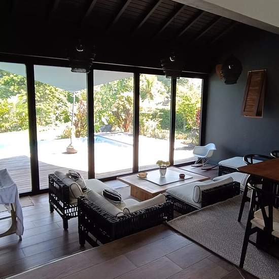 Très belle Villa T4 meublée de 170m2, prestations haut de gamme, située à Bragelogne Baie-Mahault dans un quartier calme proche des commerces et de la ZI de Jarry, comprenant : 1 entrée avec placard, 1 cuisine aménagée et entièrement équipée, 1 wc indépendant, 1 double séjour, 1 terrasse couverte et fermée, 1 suite parentale climatisée avec dressing et salle de bain, 1 dégagement avec placard buanderie avec lave linge et sèche-linge, 2 chambres climatisées avec chacune sa salle d'eau complète. 1 terrasse, 1 piscine au sel et à débordement, b...