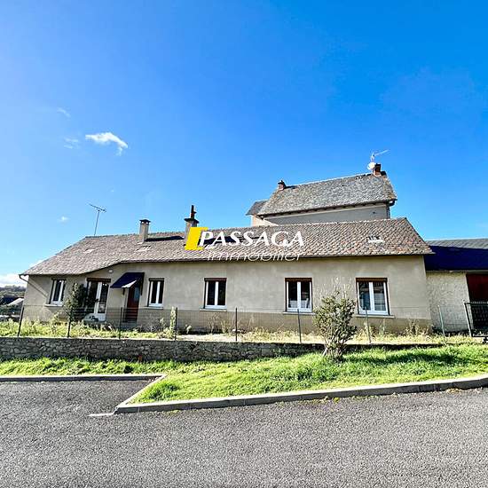 BOZOULS : Maison T4 de plain pied au coeur de BOZOULS comprenant cuisine (meubles hauts et bas, hotte, plaque de cuisson induction, four), séjour avec cheminée/insert, dégagement coin nuit, trois chambres, une salle d'eau, un WC individuel. Chauffage individuel gaz Annexes : terrain clos de 200 m² et 1 garage avec mezzanine