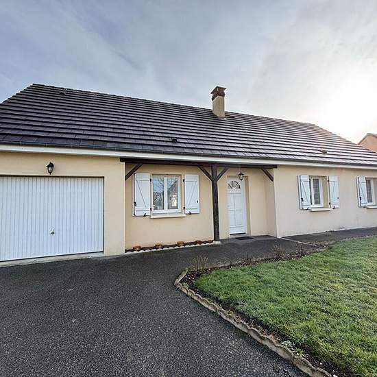 Pavillon de plain-pied de 2001 de 87 m², 5 pièces à Brou comprenant, séjour, salle à manger avec coin cuisine, dégagement, 3 chambres, salle d'eau, WC. Garage attenant , cellier, grenier. Jardin clos, le tout sur un terrain de 576 m². Chauffage central au gaz de ville. Charges comprises: 15 euros ordures ménagères, disponible début mars.
