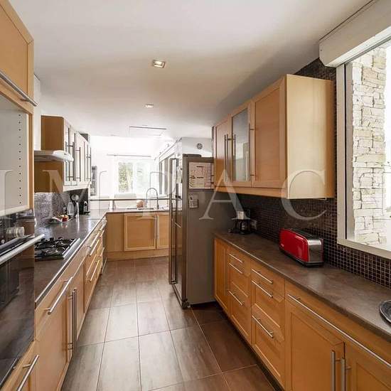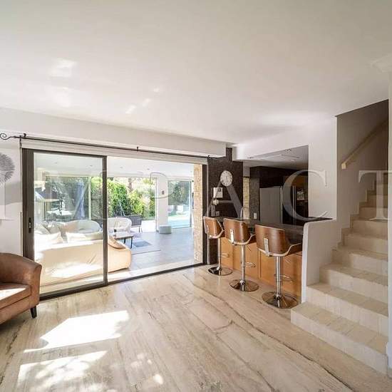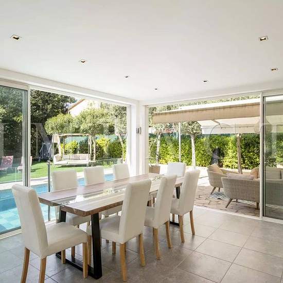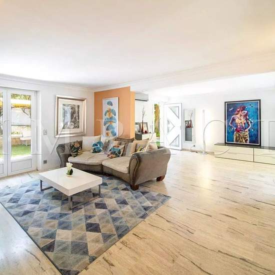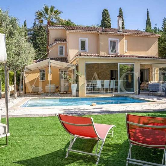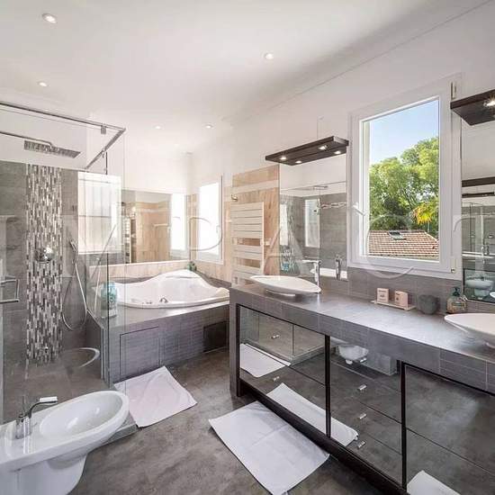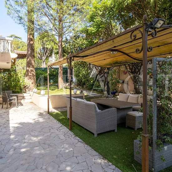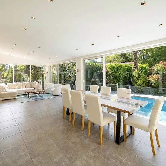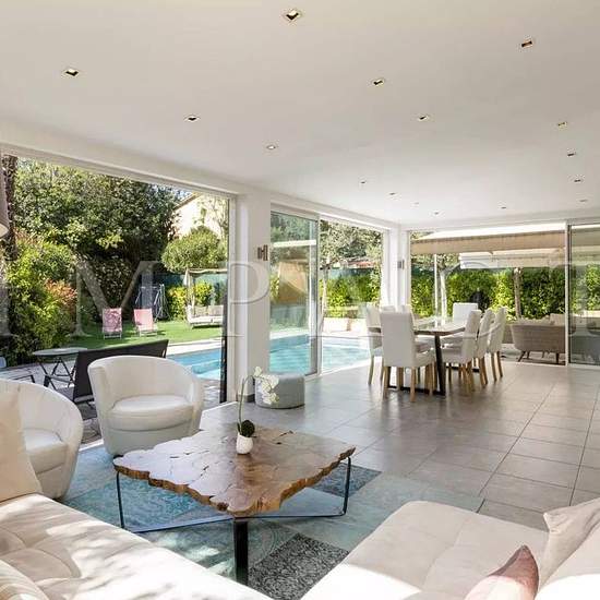 Centre Cannes villa de 220 m² habitable sur un terrain de 650 m² avec piscine. 4 Chambres – 4 salles de bain – très lumineux. Descriptif : Entrée principale ouvrant sur un jardinet ombragé avec coin salon. Accès pour 3 voitures. Belle entrée sur le salon avec espace TV, penderie et bibliothèque. Dans la continuité, nous retrouvons une belle terrasse intérieure toute vitrée avec grand canapé et une table de repas pour 8 personnes qui est ouverte sur la cuisine toute équipée (frigo américain – second réfrigérateur) et la buanderie (avec lave-l...