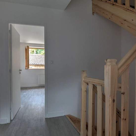 Chagnon, town center, 4-room village house in triplex built above a garage with terrace. On the ground floor: entrance (3.84 m²), open kitchen onto living/dining room (30.90 m²), WC (2.18 m²) and laundry/storeroom (3.88 m²); on the first floor: two bedrooms (11.36 m² and 10.15 m²), shower room (4.65 m²), separate WC (1.20 m²) and terrace (13.80 m²); on the second and top floor: one bedroom (15.30 m² (34.36 m² floor area)). Garage of 30.87 m² with motorized sectional door. PVC double-glazed windows/frames, electric roller shutters; individual...