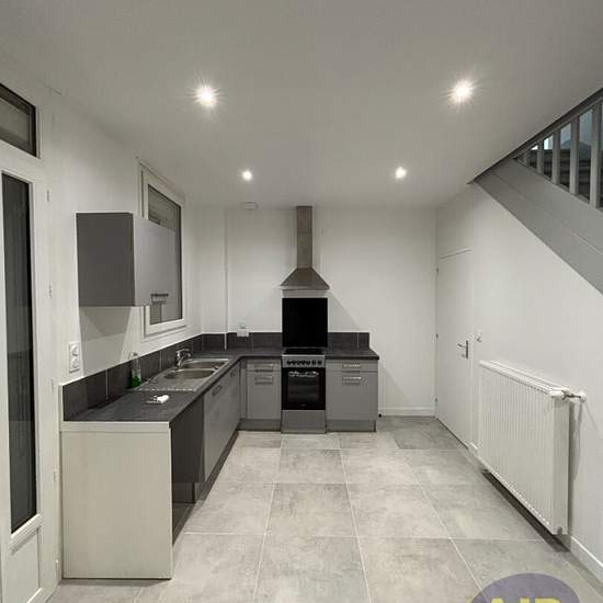 Maison Cholet 93.57 m2. A louer, jolie maison entièrement rénovée située côté Nord Cholet et offrant : une entrée sur couloir avec wc séparés - une première chambre en rez-de-chaussée - une cuisine aménagée et équipée - une belle pièce de vie donnant sur un jardin clos avec un abri de jardin - A l'étage : 2 chambres - une salle d'eau et un meuble double vasque - wc séparés - Une cave Libre prochainement