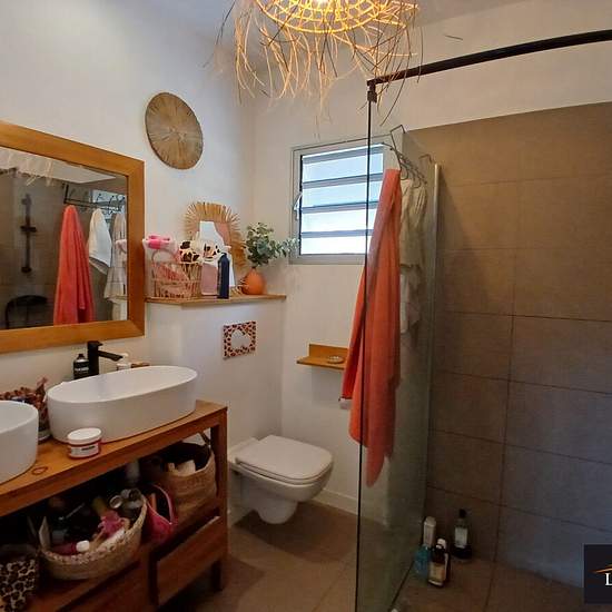 Villa F4 d'une superficie d'environ 90m² composée d'une cuisine équipée et aménagée, d'une buanderie, d'un séjour, d'un WC indépendant, d'une salle d'eau avec WC, de trois chambres climatisées avec placards, d'une grande terrasse couverte donnant sur le jardin. Nombreux espace de stationnement pour les véhicules. Jardin entièrement clôturé et arboré. Villa entièrement meublée ! Pour tous renseignements ou visites contacter Soleine : 76.36.36