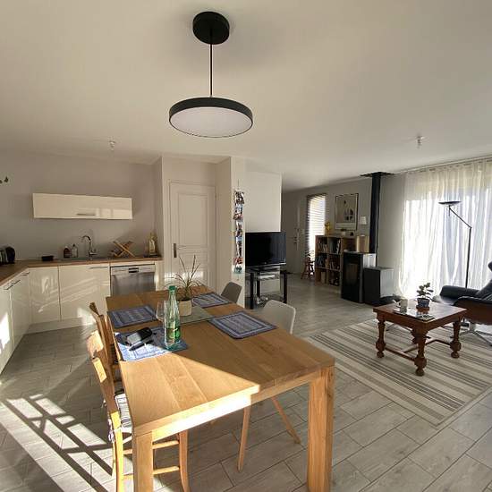ECOUFLANT - MAISON T4 NON MEUBLEE - DISPONIBLE LE 02/01/2026 Maison de 2014 de 82,21m² (98.18m² au sol) situé dans une impasse calme, comprenant au RDC: une entrée, un salon avec poêle à granulés et cuisine aménagée et équipée (plaque de cuisson vitrocéramique, hotte et four), un WC, une chambre avec dressing. A l'étage, un palier desservant 2 chambres avec dressing, une salle de bains et douche et WC. Jardin avec terrasse, pergola et cabanon. 2 places de stationnement. REF : 3673 DPE : B Disponible le 02/01/2026 Notre agence L'ADRESSE ANJOU...