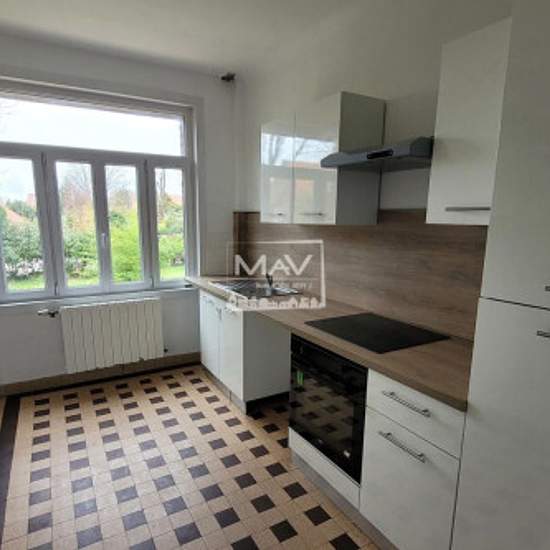 A LOUER - ENGLOS Centre-Village- Dans une rue calme, Maison bel-étage totalement rénovée d'environ 100 m² offrant une entrée avec vestiaire, double salon-séjour d'environ 32 m² avec insert, une cuisine séparée équipée, WC séparé. A l'étage, trois belles chambres d'environ 19, 12 et 10 m². Une salle de bain avec placards. Un grand jardin avec terrasse. Un sous-sol complet avec buanderie et garage. Menuiserie double vitrage - Chauffage central Fioul et cheminée feu de bois. A proximité des commodités et axes routiers. Disponible mi février. Lo...