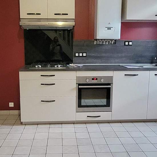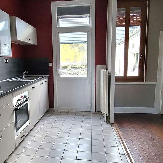 Maison T4 À Louer au Creusot. Quartier la Couronne, maison T4 mitoyenne d'un côté de 90m², sur cave, offrant une petite entrée, une cuisine équipée ( plaque de cuisson gaz de ville, four, hotte, meubles haut et bas) avec accès à la terrasse et ouverte sur le séjour, un salon, une chambre au rdc, une salle de douche avec WC séparé, et à l'étage 2 grandes chambres avec dressing chacune. Chaudière gaz de ville individuelle de 2023, VMC. Jardinet, buanderie, et un GARAGE en face de la maison. Libre de suite Loyer:799/mois dont 12€ de provisions ...