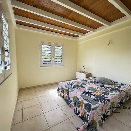 À LOUER ! Venez visiter cette maison mitoyenne meublée, de 128m2 au sol, sur deux niveaux, dans le quartier de Gondeau, au Lamentin En rez-de-chaussée, vous serez accueillis dans un séjour/ salle à manger ouvert sur terrasse équipé d’une table avec chaises, d’un canapé, d’un meuble télé et d’une table basse Ce bien dispose d’une cuisine aménagée et équipée d’un réfrigérateur, d’un four, d’un micro-ondes et d’une plaque de cuisson Vous poursuivrez votre visite dans un couloir menant à deux chambres munies chacune de leur lit et armoire Une sa...