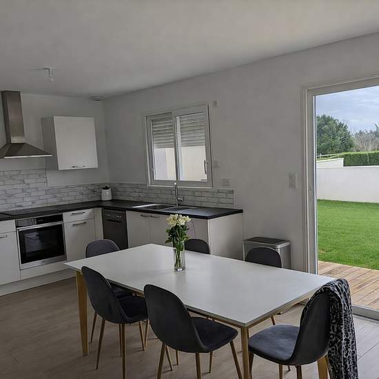 Découvrez cette maison neuve de 80 m² construite en 2021, lumineuse et moderne, et située dans un hameau au calme, idéale pour une famille ou un couple recherchant confort et tranquillité à Longeville-sur-Mer. Elle se compose de : 3 chambres dont 2 avec placards intégrés, salon-séjour lumineux avec cuisine ouverte équipée , grande salle d'eau moderne avec douche à l'italienne et double vasque, WC séparés pour plus de confort A l'extérieur : Terrasse et jardin clos de 360 m², Garage avec emplacement parking privé Chauffage clim réversible dan...