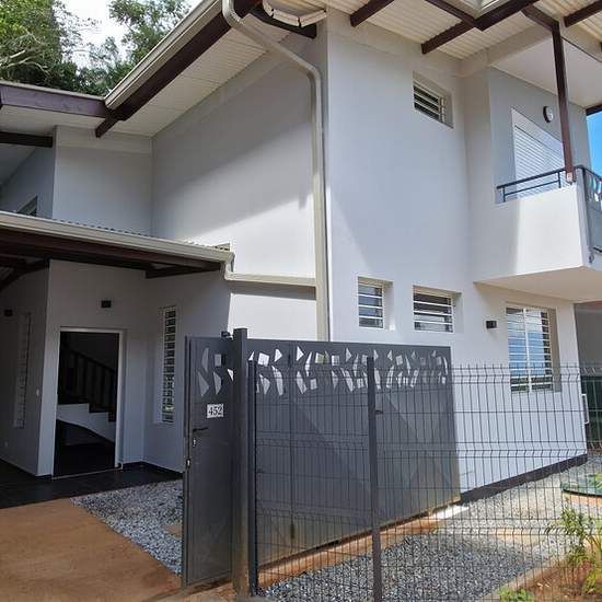 Découvrez cette charmante maison jumelée en duplex de type T4, idéalement située sur la commune de Matoury.Alliant confort moderne et espace, elle offre un cadre de vie agréable, parfait pour une famille. Au rez-de-chaussée, vous apprécierez un séjour lumineux, une cuisine américaine fonctionnelle avec son cellier attenant, un WC indépendant, ainsi qu’une chambre climatisée avec placards, salle d’eau et WC privatifs.À l’étage, un dégagement dessert deux chambres climatisées, une salle d’eau, un WC indépendant, et un balcon de 3,91 m², idéal ...