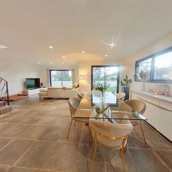 Réf Annonce : LM1768 Maison moderne toit plat F4 de 112,47 m² env. en duplex située dans le centre-ville de Montrond-les-Bains 320 rue Pierre Frénéat, dans un secteur calme, proche des commodités et en excellent état. Elle se compose au rez-de-chaussée d'un séjour spacieux et lumineux ouvert sur une cuisine équipée et d'un wc avec lave-mains, accès à la terrasse et au jardin. A l'étage, 3 chambres avec placard dont 1 avec balcon (le dressing de la 3ème peut être cédé par les occupants), salle de bains double vasque avec douche et baignoire, ...