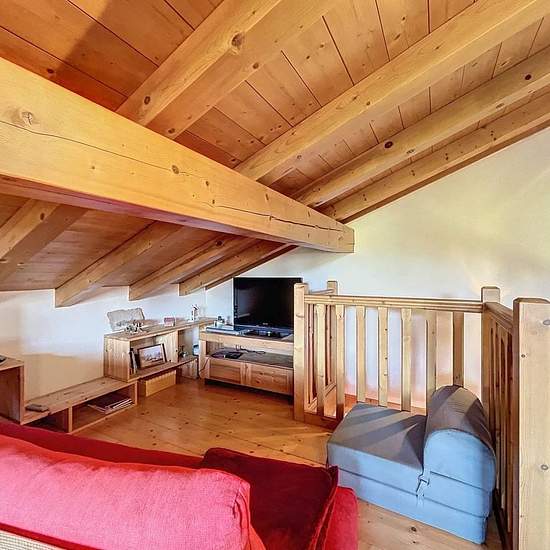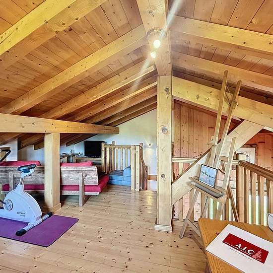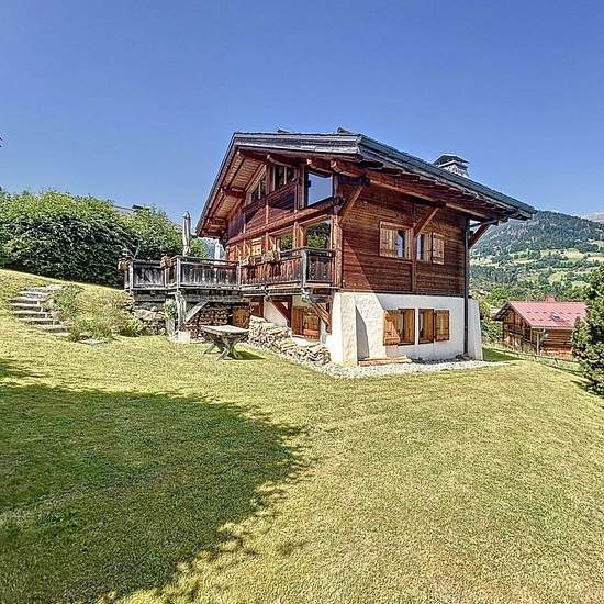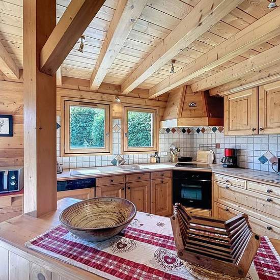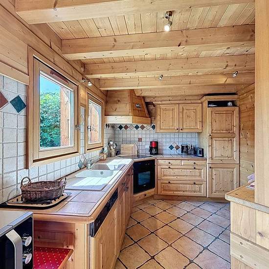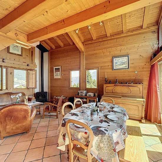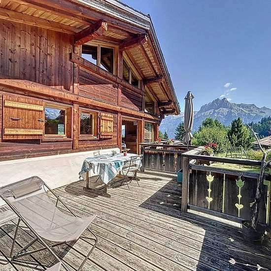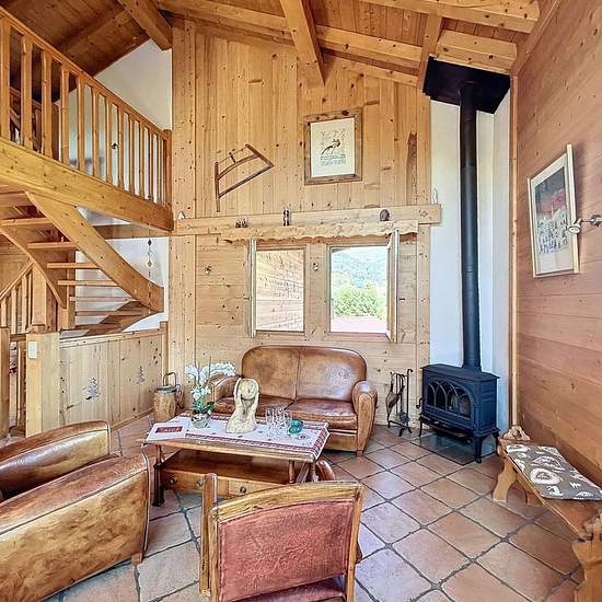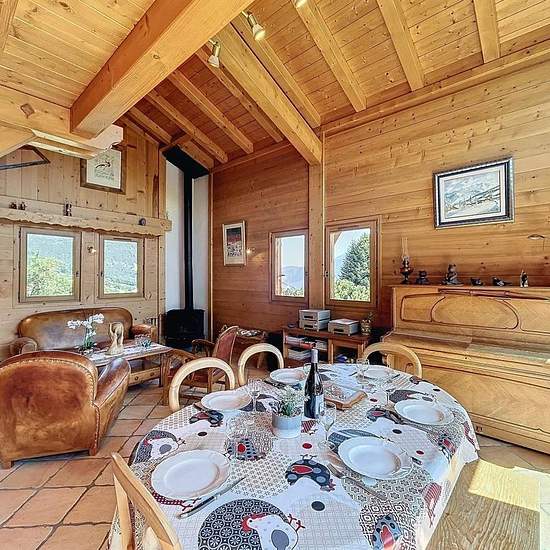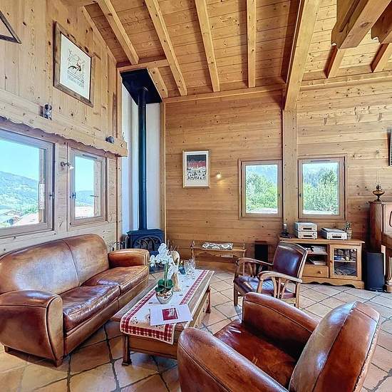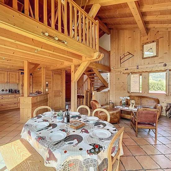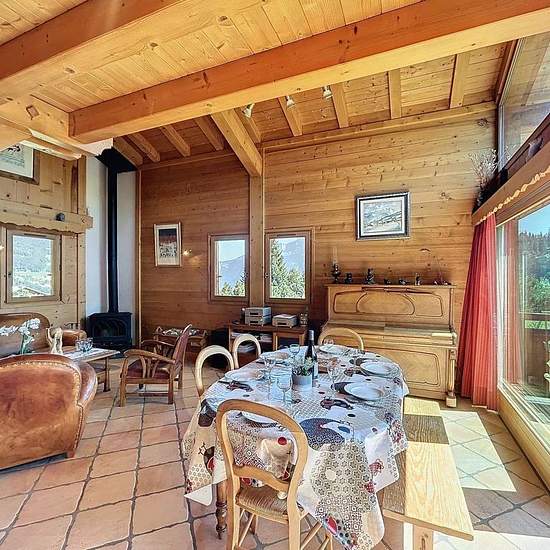 Chalet avec vue Mont Blanc composé d’une entrée avec un accès garage utilisé comme buanderie et local à ski, placard, un wc avec lave-main, une pièce de vie avec une cuisine ouverte tout équipée (micro onde, cafetière, bouilloire, grille pain, 4 feux vitro céramique, four, lave vaisselles, frigo, congélateur) donnant sur une terrasse exposée Est/Sud. A l’étage, une mezzanine avec coin TV et espace jeux. En rez de jardin, une salle de bain, une salle de douche, un wc, une chambre de trois lits simples de 90, une chambre avec lit de 160 et pla...