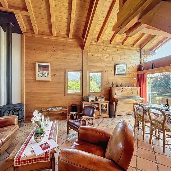 Chalet avec vue Mont Blanc composé d’une entrée avec un accès garage utilisé comme buanderie et local à ski, placard, un wc avec lave-main, une pièce de vie avec une cuisine ouverte tout équipée (micro onde, cafetière, bouilloire, grille pain, 4 feux vitro céramique, four, lave vaisselles, frigo, congélateur) donnant sur une terrasse exposée Est/Sud. A l’étage, une mezzanine avec coin TV et espace jeux. En rez de jardin, une salle de bain, une salle de douche, un wc, une chambre de trois lits simples de 90, une chambre avec lit de 160 et pla...