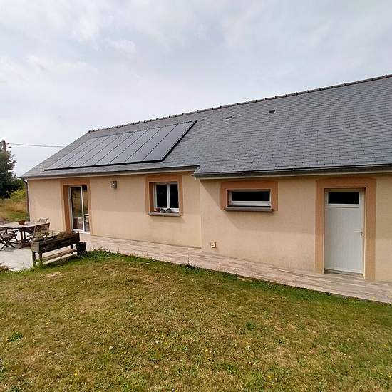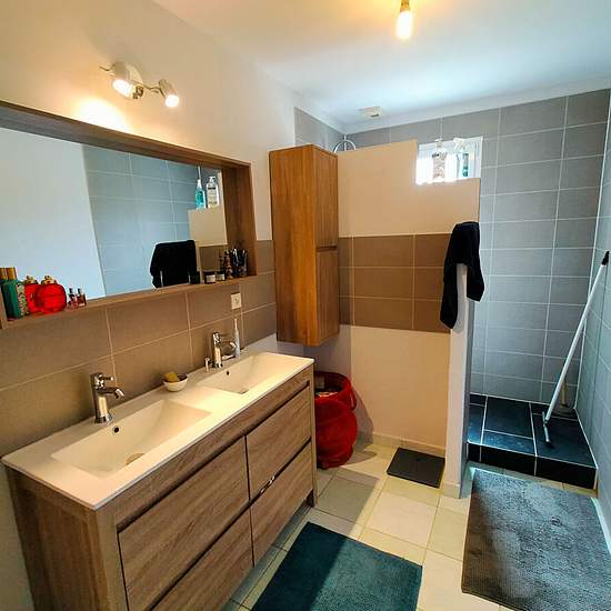 pavillon de plain-pied comprenant une entrée desservant un séjour avec un espace cuisine, un salon, un dégagement desservant trois chambres, salle d'eau et des toilettes séparées. Un cellier attenant avec douche et lavabo, un garage. terrasse, jardin, pelouse