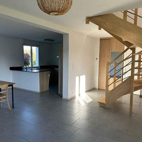 Maison à louer Au rez-de-chaussée 1 grande pièce de vie avec WC et placard a l'entrée, cuisine aménagée et équipée. A l'étage 3 belles chambres et une salle de bain avec WC. 1 garage, 1 terrasse et un très beau jardin arboré Maison située dans une impasse a 500 m de la boulangerie , pharmacie. A 2,5km de la première plage..