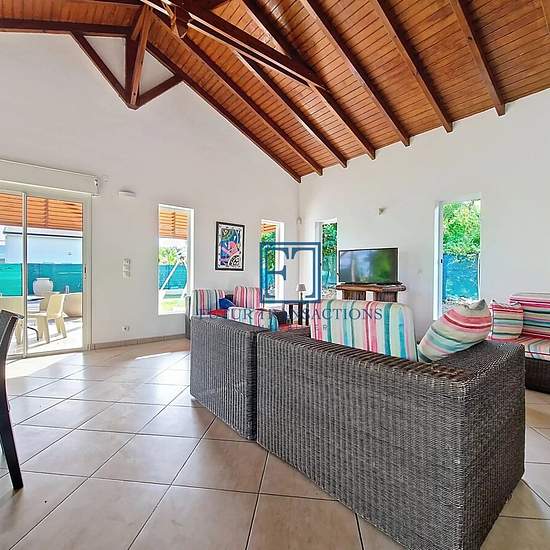 Découvrez en location cette splendide villa de 160 m² située à Saint-François, à quelques pas du centre-ville, nichée sur une colline, agréablement ventilée et dotée d'une piscine confortable. Vous aurez plaisir à profiter de cette vaste terrasse pour partager d'agréables moments de détente. cette villa meublée est composée d'un vaste séjour et d'une cuisine équipée ouverte tournée vers l’extérieur grâce à ses grandes baies vitrées. Un couloir conduit vers le coin nuit en bas, comprenant un toilette indépendant pour les invités, une salle de...