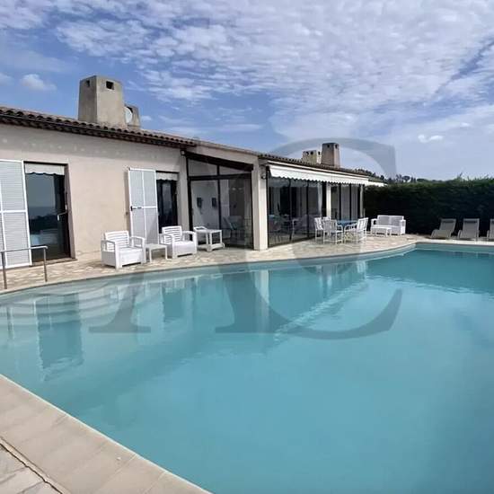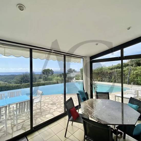 A louer, charmante villa 4 pièces entièrement climatisée. Vue dégagée sur le Cap d'Antibes. -Piscine -Garage -Orientée Sud / Sud Est -3 Chambres