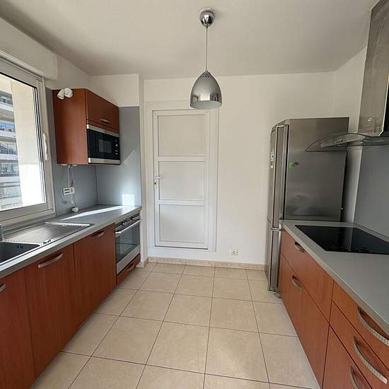 Appartement en duplex de Type 5, situé au 5ème étage avec ascenseur, composé au 1er niveau d'un séjour climatisé, une salle à manger, une cuisine équipée (éléments hauts et bas, plaque, hotte, four, lave-vaisselle, réfrigérateur, micro-ondes), un wc et une grande terrasse avec vue mer (55 m²) ; puis au second niveau : un dégagement, 2 chambres avec placards aménagés et climatisations, 2 chambres dont une avec placard aménagé, une salle de bains avec wc, une salle d'eau et 2 balcons. Le logement comprend un garage double en sous-sol.