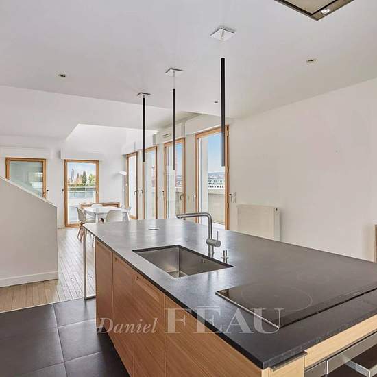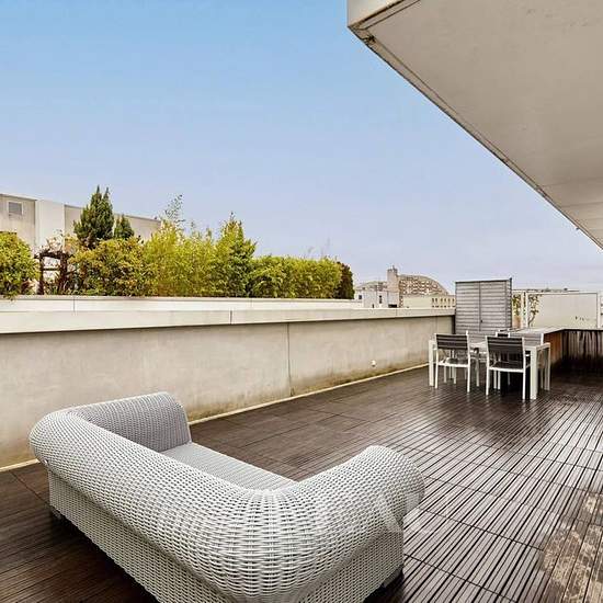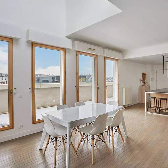 Avenue Pierre Lefaucheux, Au sein d'un immeuble récent sécurisé, aux derniers étages, bel appartement meublé, en duplex de 138m2 avec deux grandes terrasses de 68m2 et 18m2. Il se compose d'un vaste séjour avec cuisine dînatoire ouverte, aménagée et équipée, une chambre et une salle de douche avec toilettes. A l'étage, un dégagement mène à une chambre de maître avec accès direct au solarium, deux chambres avec balcons, une salle de bains et des toilettes séparées. Très lumineux avec des vues panoramiques, ce duplex bénéficie de belles presta...