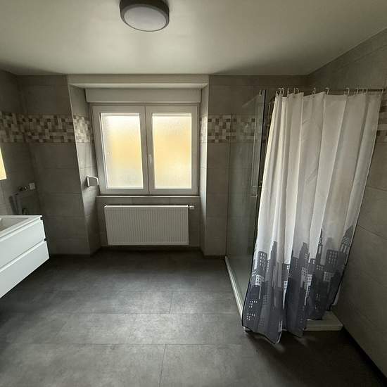 Appartement de type F5 en duplex : Au RDC : hall d'entrée, une première chambre de 10.5m2, Wc suspendu séparé, cuisine équipée (four / hotte / plaque de cuisson) ouverte sur un séjour de 28m2. A l'étage : deux chambres, salle de bains : douche italienne, Wc, double vasque. Loyer 650? + 150? de charges : eau, chauffe, OM