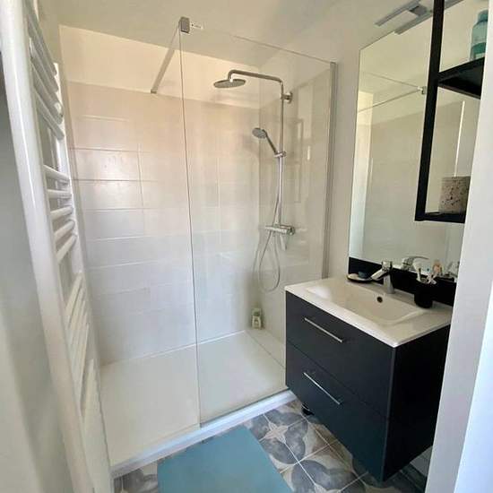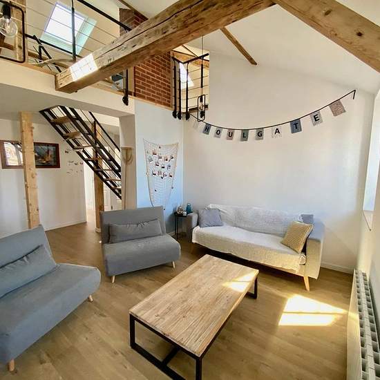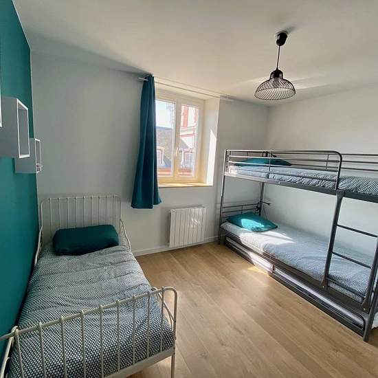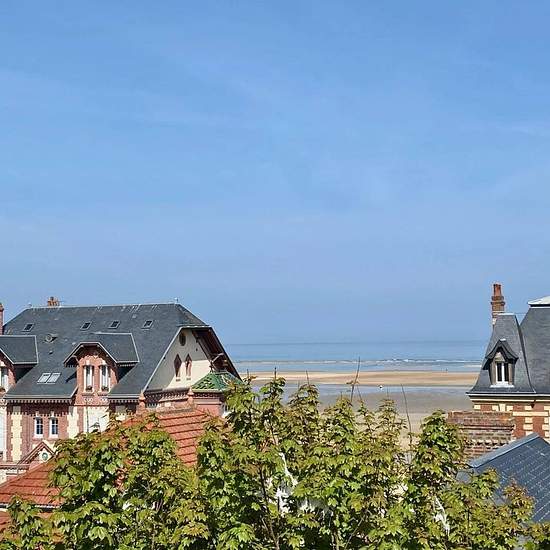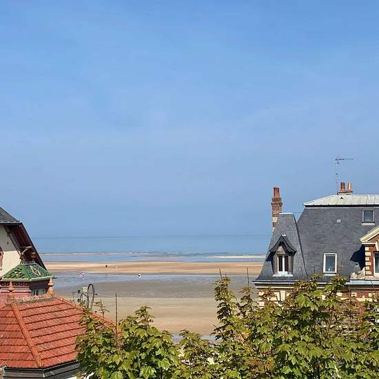 Location de vacances pour 8 personnes d'environ 85 m2, dans la rue principale de Houlgate, à deux pas de la plage, entièrement rénovée, au deuxième étage sans ascenseur, comprenant une belle pièce de vie avec vue mer, une cuisine ouverte aménagée et équipée, une chambre (2 lits simples de 80), une chambre (4 lits simples de 90), une chambre (lit double de 140) avec salle de douche, wc séparé, une salle de douche et une mezzanine d'environ 20 m2 (espace jeux et détente). Présence d'un billard dans l'appartement. A réserver vite ....