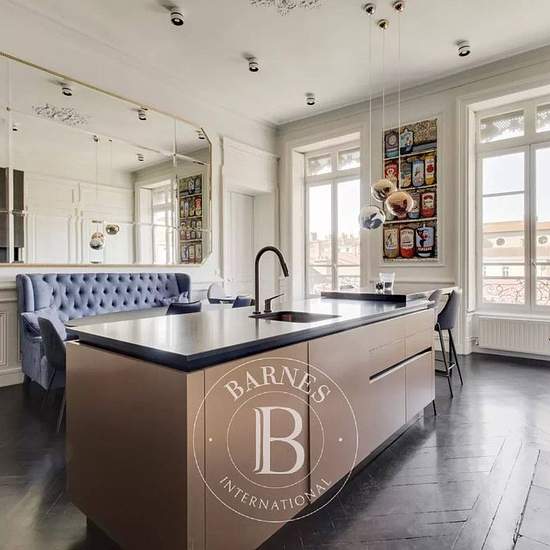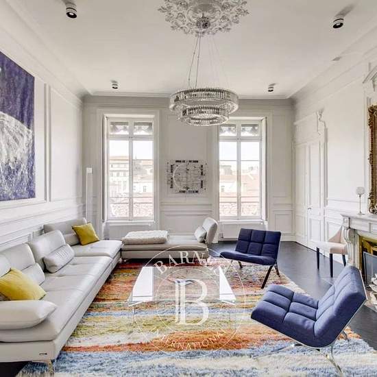 EXCLUSIVE - LYON 2 - AINAY. Located on the 3rd floor of an older building with elevator, this exceptional furnished apartment of 218.64 m² comprises a nice entrance with storage, a living area giving access to a fitted and equipped kitchen with its dining room, and an independent TV lounge. The sleeping area includes two bedrooms, one of which is a master suite with a bathroom containing a shower and bathtub, and a second shower room. A cellar and a private parking space complete this property. Immediate proximity to shops, schools and trans...