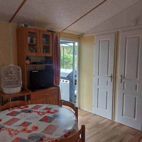 Mobil home année 2006 - 6 personnes Surface 32m2 - 2 chambres dont une avec 1 lit 140X180 et une avec 2 lits 90X180 + possibilité 1 lit 140X180 dans le salon dans le canapé convertible - cuisine équipée d un four électrique - d une plaque de cuisson au gaz -d’un frigidaire - une table ronde avec 1 rallonge centrale - 4 chaises - 1 toilette séparé - une salle de bain avec douche et lavabo - nombreux placards - Se situe à Montreuil Bellay dans le Maine et Loire au camping les Nobis d Anjou - À venir chercher sur place - frais de transport à vo...