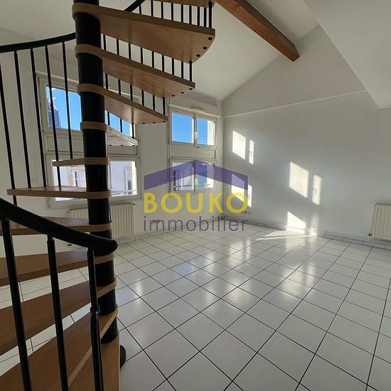 NANCY Appartement au 3e étage en duplex de 84m2 offrant entrée avec placard, 1 lumineux salon séjour, 1 cuisine US équipée, 3 chambres, salle de bain, wc, Possibilité de louer un garage 63 euros par mois. Libre de suite Loyer 730 euros et 50 euros de charges Frais agence 730 euros BOUKO IMMOBILIER - -