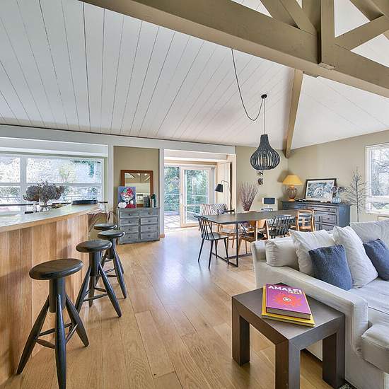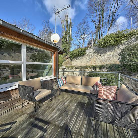 EXCLUSIVITE A 10 mn du centre ville à pieds : commerces, écoles, Bus pour le Lycée international / accès possible en vélo, 15 mn du RER à pieds, esprit maison pour cet appartement contemporain de 150.58 m2 loué meublé représentant tout le premier et dernier étage d'une Maison ancienne 1950 divisée et agrandie en Ossature Bois très moderne avec jardin privatif de 100 m2 environ et entrée indépendante, agencé comme suit : entrée, séjour de avec poêle donnant sur terrasse de 21 m2 au calme avec vue sur le jardin sans vis à vis, cuisine ouverte ...