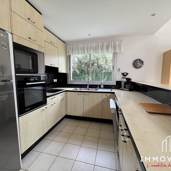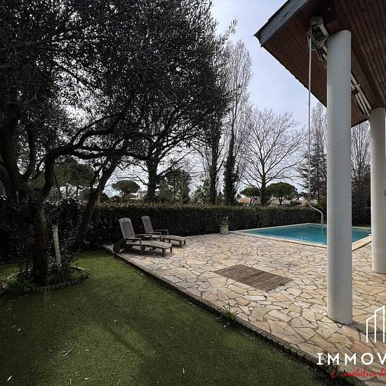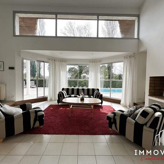 About this property Immovance Montpellier offers for rent this superb architect-designed villa on the Massane Golf course on a 766m2 plot. The two-level house of approximately 160m2 comprises a beautiful living area opening onto the garden and pool, a dining area opening onto a fully fitted and equipped open kitchen. In the back kitchen there is a large utility room and access to the garage. On the same level you will find a master suite with pool view, as well as a bedroom and a shower room with toilet. Upstairs there are two large bedroom...