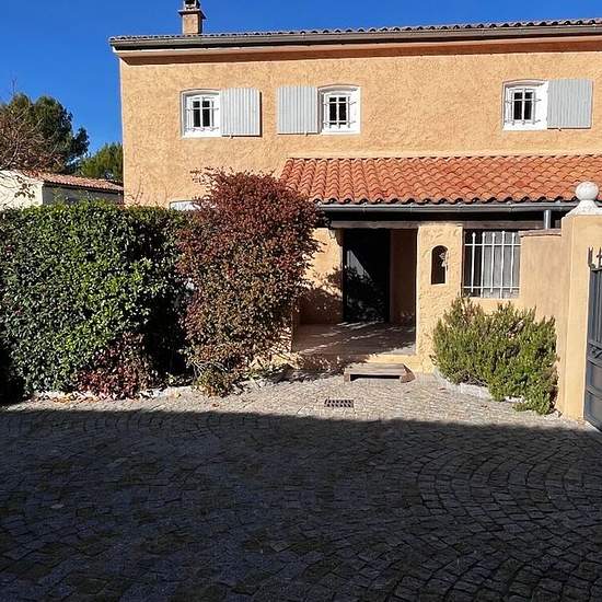 Maison T5 à louer. Idéalement située sur la commune de Bouc Bel Air, cette maison d'habitation mitoyenne par les garages dispose de nombreux atouts. Elle se compose en rez-de-chaussée d'une pièce à vivre, d'une cuisine indépendante, d'une chambre donnant sur une terrasse couverte, d'une buanderie, d'une salle de bains et d'un wc. A l'étage, trois chambres supplémentaires, une salle de bains avec wc et un bureau avec dressing. Le bien dispose d'un jardin privatif, d'une terrasse et de places de parking dans la cour. Au calme absolu.