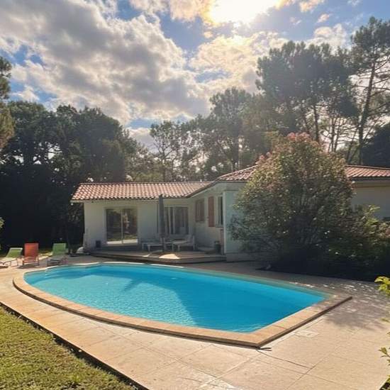 Maison avec piscine. Maison familiale à louer à l'année à Capbreton. D'une superficie de 114m² , cette maison meublée de plain pied se compose d'un vaste séjour- salle à manger - cuisine moderne et parfaitement équipée, une suite parentale avec salle d'eau privative, un espace nuit avec une salle d'eau et 3 autres chambres (2 chambres doubles et une chambre avec un lit simple et des lits superposés). Une buanderie avec une troisième salle de douche attenante. La maison est entourée de terrasses permettant de profiter de plusieurs expositions...