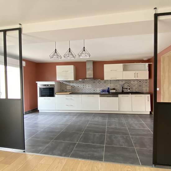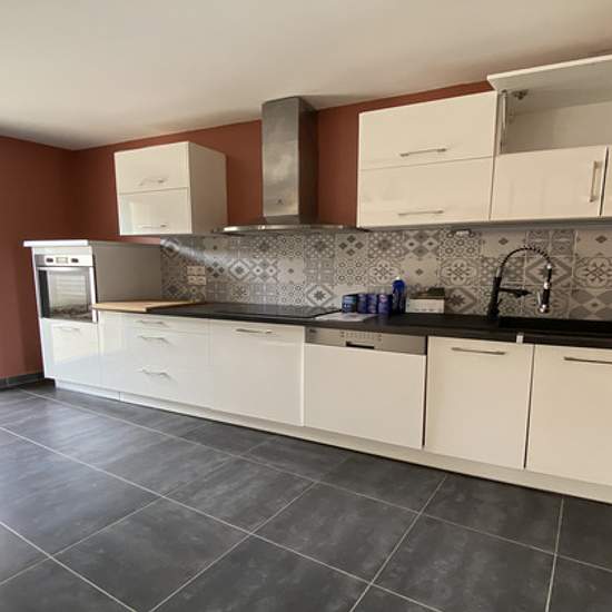Superbe maison récente (2017) T5 de 118m2 en duplex et décorée avec goût dans un quartier calme, comprenant: Au RDC : grande entrée, cuisine équipée (plaque de cuisson, hotte, four et lave vaisselle), séjour, salle à manger avec grande baie vitrée, un espace buanderie et un WC avec point d'eau. Accès à l'extérieur par le séjour et la cuisine. A l'étage : 3 belles chambres dont 2 avec placards, une salle de bains avec double vasques et un WC. Une place de stationnement devant la maison. Stationnement facile dans le quartier. Chauffage Electri...