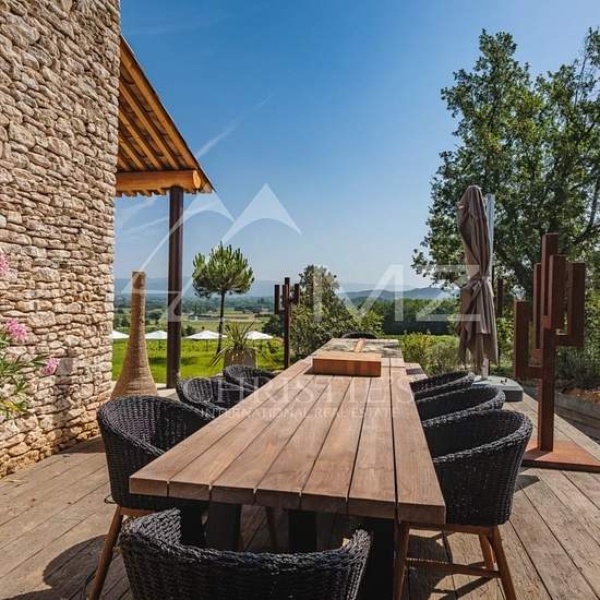 À quelques encablures du centre du village de Gordes, se dresse cette propriété unique, découvrant une vue dégagée et panoramique face à la campagne gordienne et un authentique moulin provençal. Un jardin délicatement paysagé intègre une belle piscine chauffée agrémentée de confortables sunbeds et de larges parasols. Vous serez immanquablement séduits par la qualité et le degré de raffinement des intérieurs. Une décoration originale, chaleureuse, soignée et recherchée, qui mêle subtilement les matières et matériaux (rideaux en lin, murs à la...