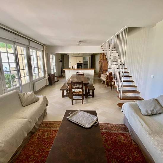 Location de vacances - Villa située en bord de mer et en plein centre ville de Houlgate, comprenant au rez de chaussée, une entrée sur un salon séjour avec une cuisine ouverte aménagée et équipée, wc, une arrière cuisine, à l'étage, quatre chambres spacieuses avec accès balcon ou jardin (3 avec lits doubles et 1 avec 3 lits simple), une salle de douches, une salle de bains, wc. Possibilité de stationner 3 voitures dans le jardin. Location de vacances. 1 800 € hors saison et 2 400 € haute saison (juillet et aout) wifi
